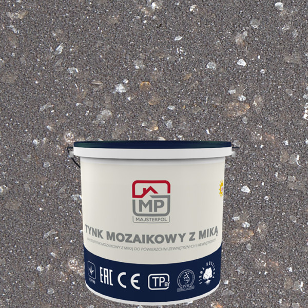 Декоративна мозаїчна штукатурка z Mika зі слюдою від польського бренду MajsterPol — це маса пластичної консистенції на основі акрилової дисперсії. До її складу входить добірна кольорова кварцова крихта з додаванням натуральної слюди, яка надає поверхні блискучого декоративного ефекту. У цій позиції представлено відтінок CERES — глибокий темний тон, що гармонійно контрастує зі світлими основами і підкреслює архітектурні елементи.